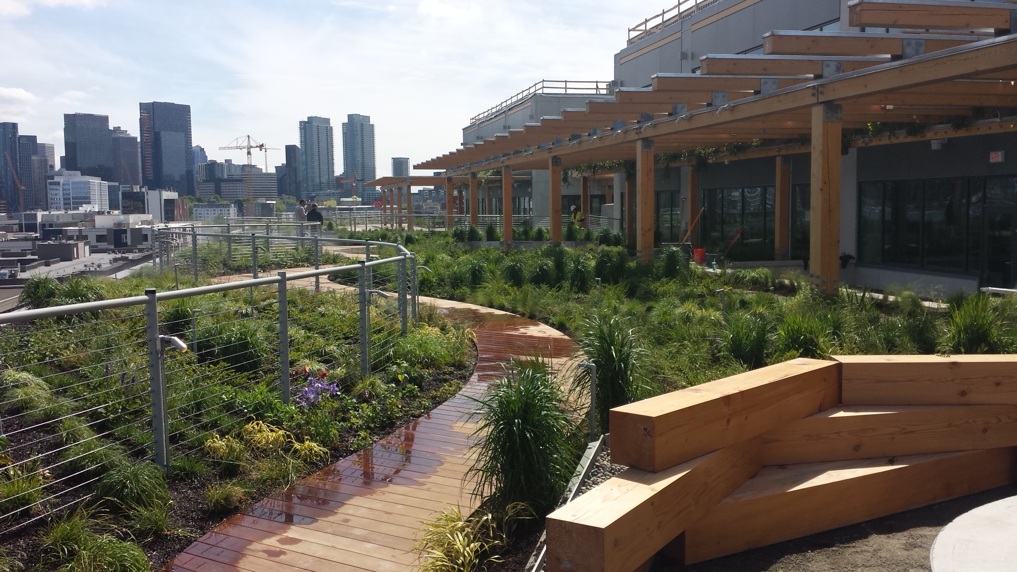 The level 7 roof is a passive space, featuring serpentine boardwalks through beds of native grasses and perennials, a large wooden arbor, fire pit, and beautiful views of the Seattle Skyline. The level 9 roof is a more traditional amenity deck comprised of wood decking and a series of large planters to break up the space.