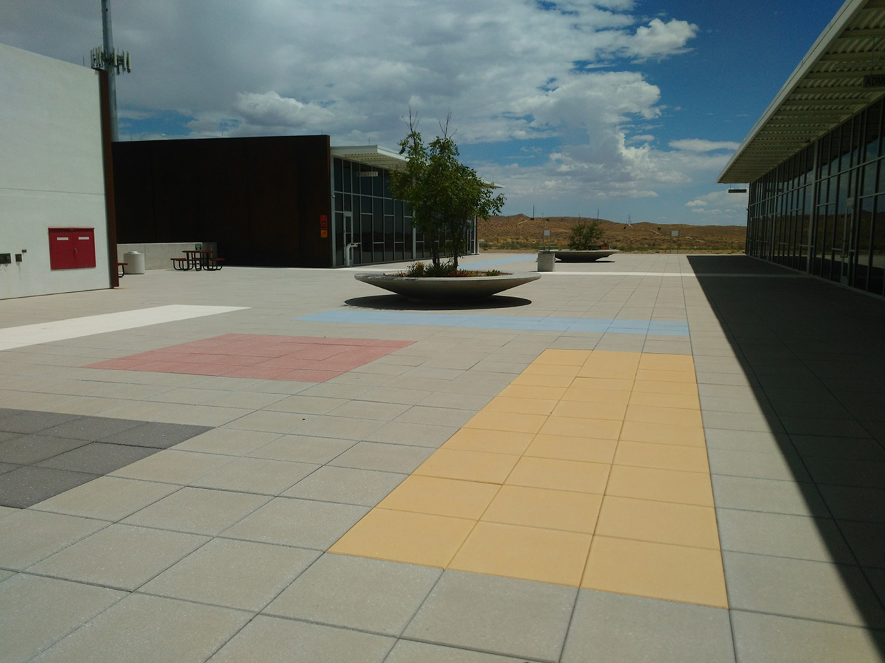 This courtyard features Super Black, Red, Yellow, Glacier White, Limestone Gray, and custom colored pavers in a geometric pattern.