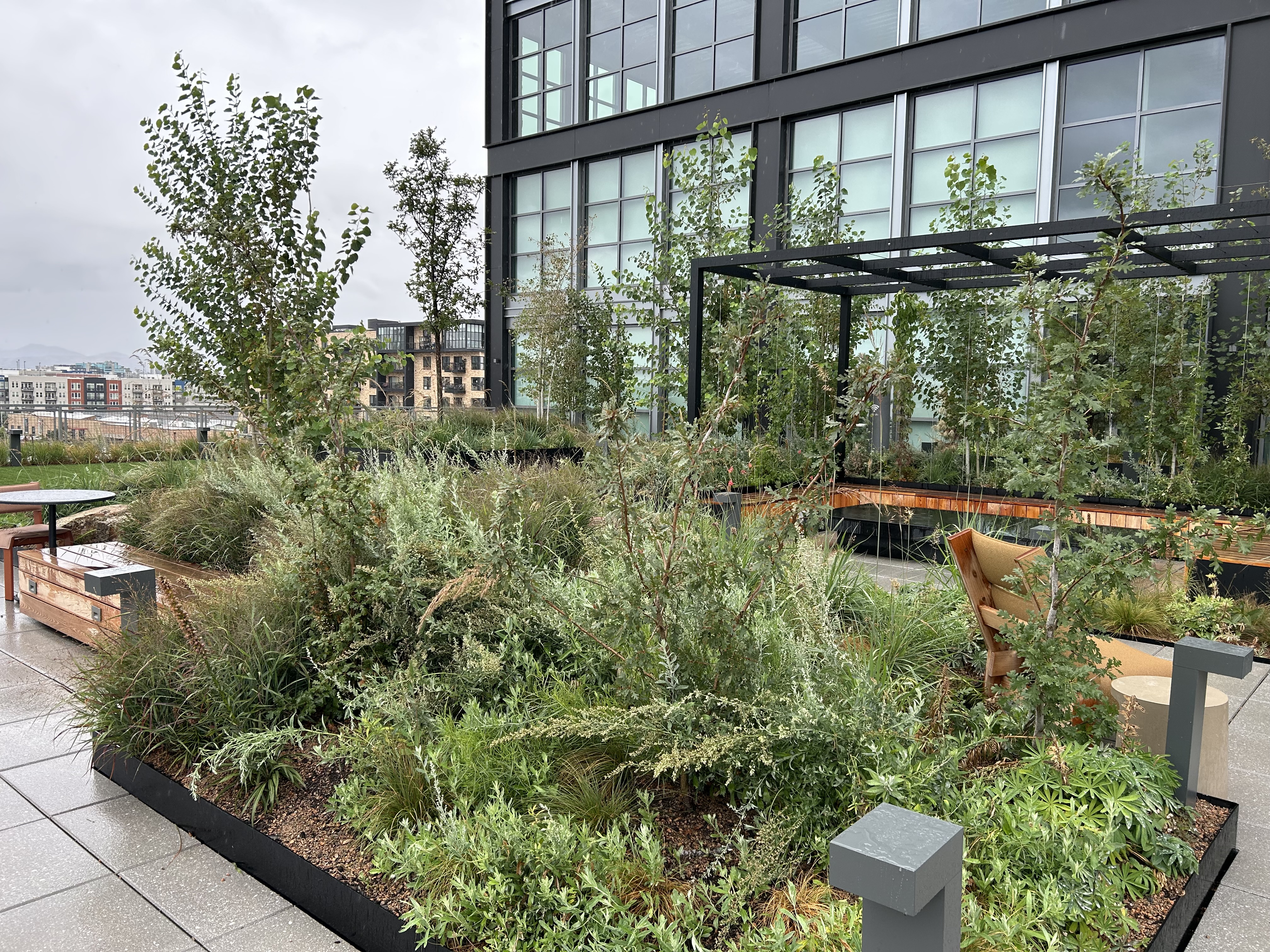 The Ultimate Assembly®, complete with open-joint pedestal pavers, covers around 78,000 square feet of various roof deck levels. Scattered throughout the outdoor decks is 13,000 square feet of the Intensive Garden Roof® Assembly. A significant feature that makes The Park an inviting and natural space is the mature trees that were lifted onto the roof and rooted into a special Hydrotech® LiteTop® Growing Media engineered for the Denver climate. This protected membrane roof assembly is designed to last the lifetime of the building and aims to help save on the building’s energy use, manage stormwater on the roof, and combat the urban heat island effect.