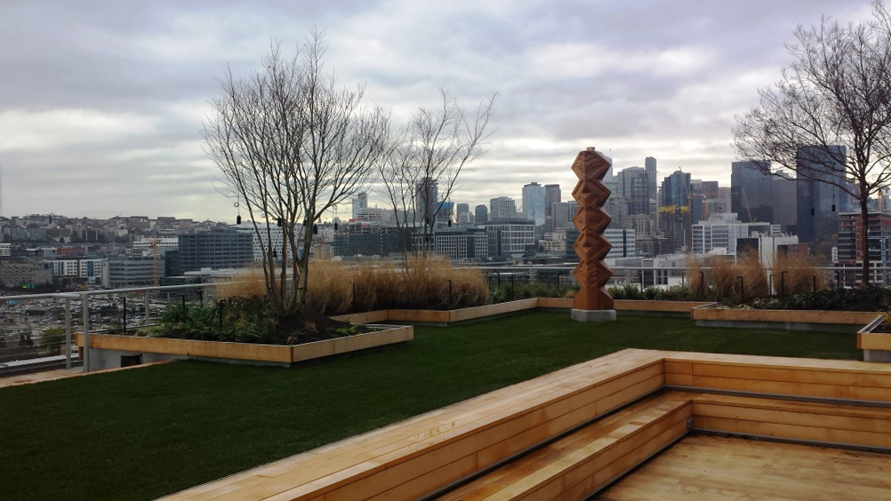 The level 7 roof is a passive space, featuring serpentine boardwalks through beds of native grasses and perennials, a large wooden arbor, fire pit, and beautiful views of the Seattle Skyline. The level 9 roof is a more traditional amenity deck comprised of wood decking and a series of large planters to break up the space.