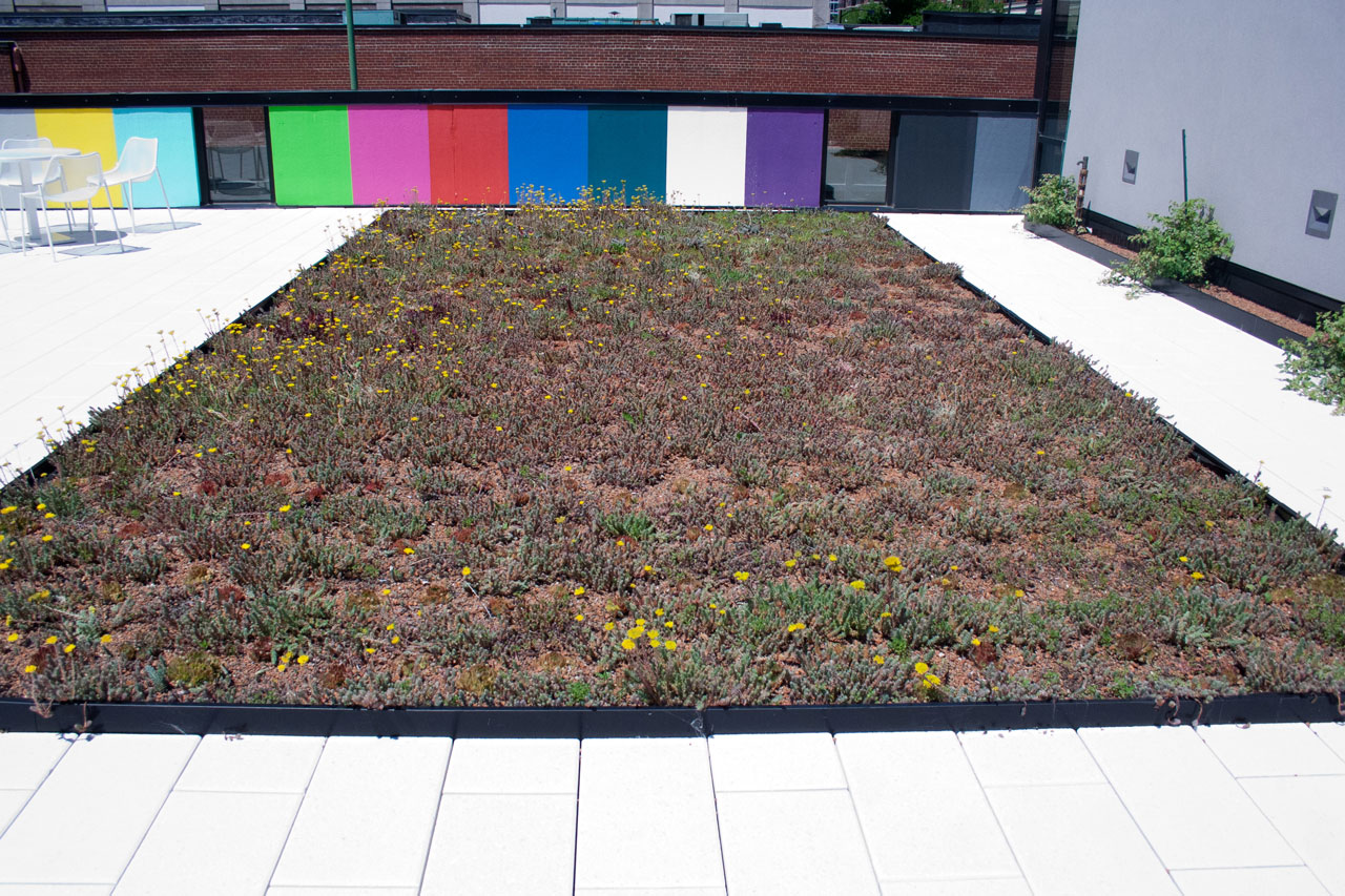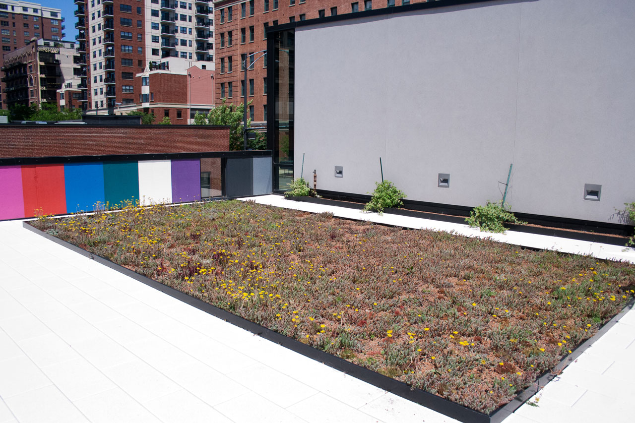 Glacier White pavers surround and accent a portion of the garden roof.