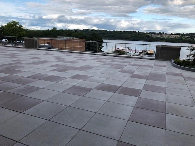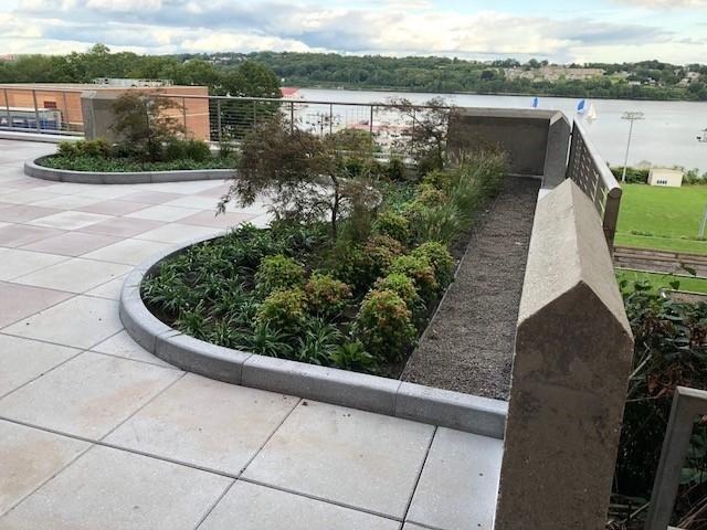 Rock Curb boarders the vegetated areas tying together this attractive amenity space that features brown and neutral Tudor pavers.