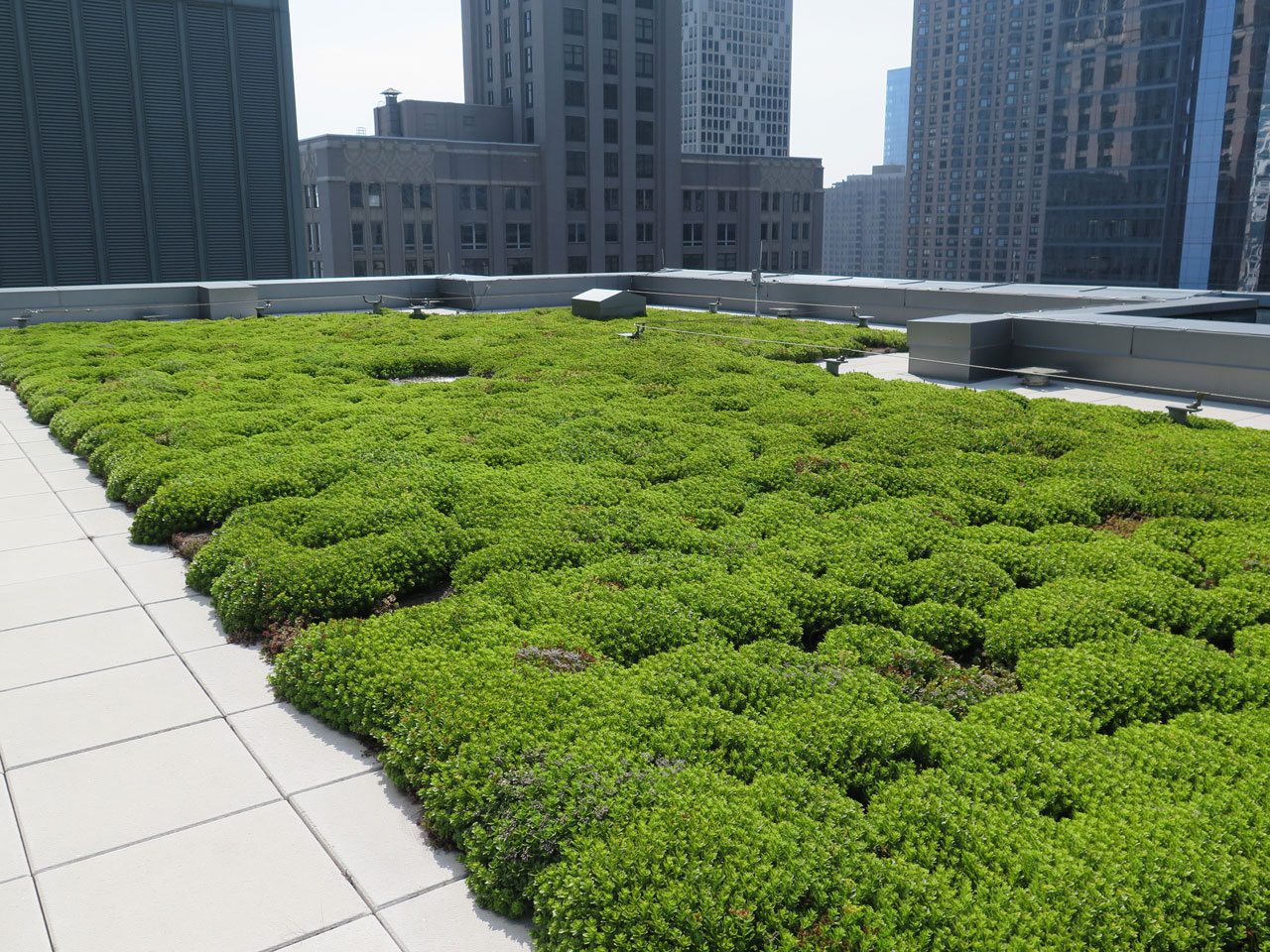 By taking advantage of available & usable rooftop space to satisfy a site’s required stormwater detention, the design and construction team met the sites stormwater requirements AND received all of the additional benefits of a vegetated roof including reducing the urban heat island effect, extending the life of the waterproofing membrane and reintroducing nature and increasing biodiversity in our urban area.