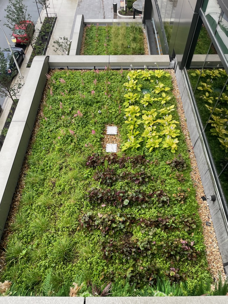 The Extensive Garden Roof® was planted with InstaGreen® Carpet, which provides almost 95% coverage at the time of installation. This is not only aesthetically pleasing, but also reduces initial maintenance requirements. The Garden Roof Assembly helps reduce the urban heat island effect, purify the air, and plays a major role in stormwater management.