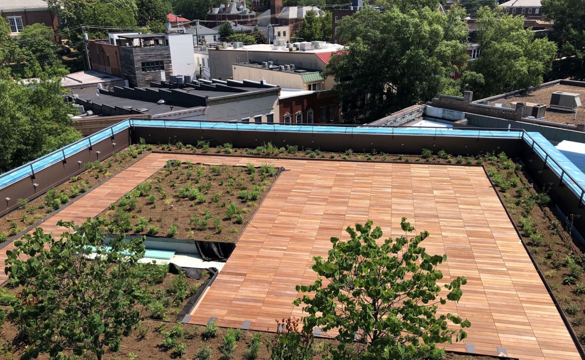 The Center of Developing Entrepreneurs (CODE) is a unique project in Downtown Charlottesville that features flexible retail and commercial office space in a dynamic urban campus. The building is comprised of multiple stepped structures that spirals around the central courtyard. Each stepped rooftop is protected with Hydrotech’s Garden Roof and Architectural Paver/Wood Tile Ultimate Assemblies, which are accessible by tenants who can enjoy panoramic views of the Blue Ridge Mountains. Rainwater captured from the vegetated roof is slowly released into two underground cisterns and can be pumped back up to the roof to irrigate the plants.