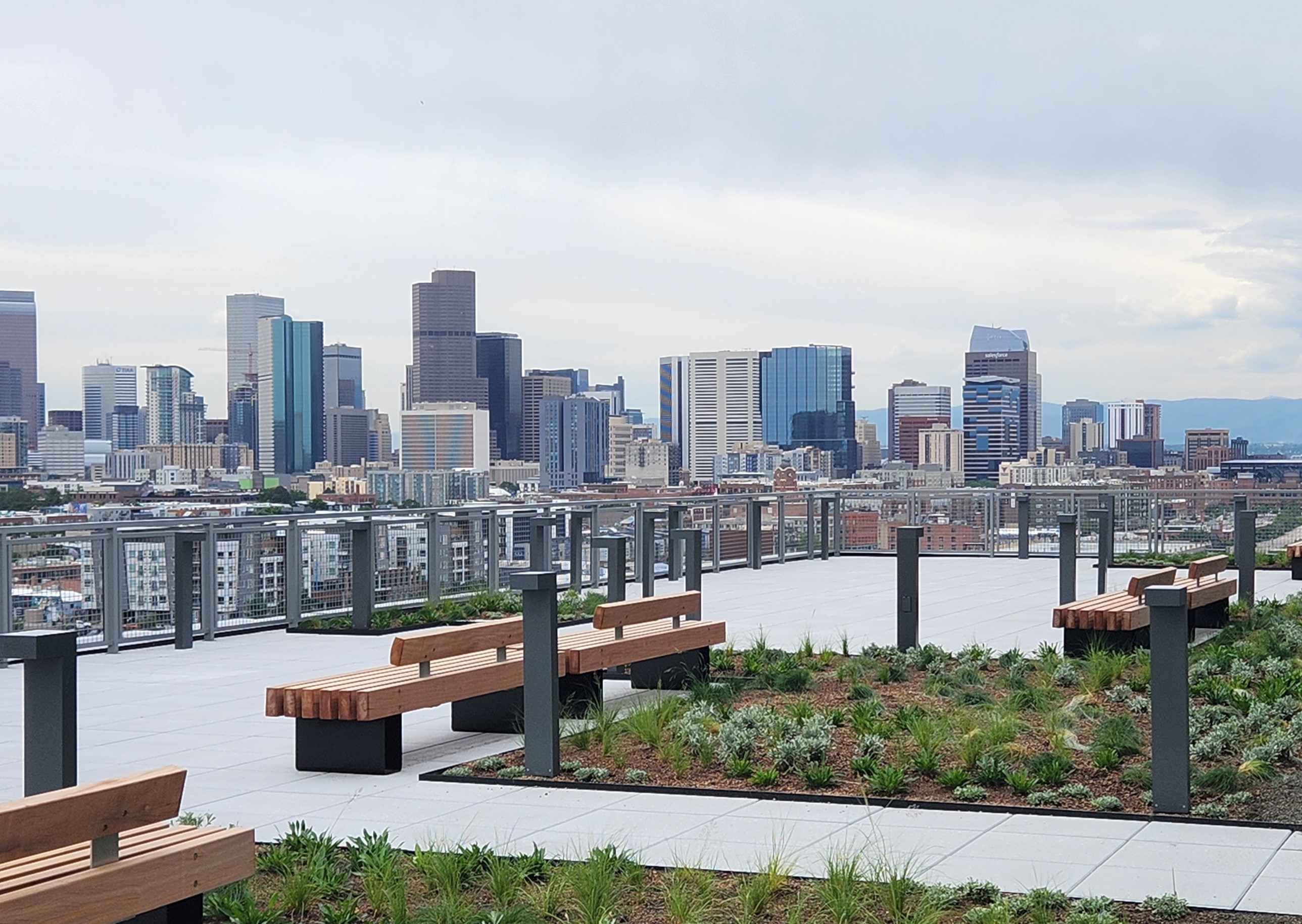 The highlight of the building is the 6th floor 10,000 square foot interior multipurpose tenant lounge that hosts a climbing wall, basketball court, conference center, yoga studio, and a barista bar. Walking out of the lounge, tenants are greeted with a 13,000 square foot private outdoor amenity deck called The Park. This amenity space offers cinematic views of the Denver skyline and creates community interaction with gathering lawns and furnished terraces.
